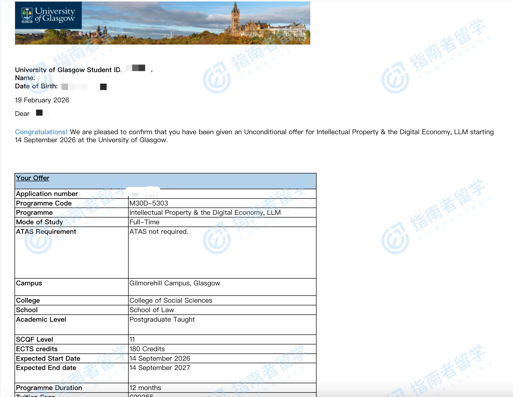 格拉斯哥大学知识产权与数字经济法学硕士研究生offer一枚