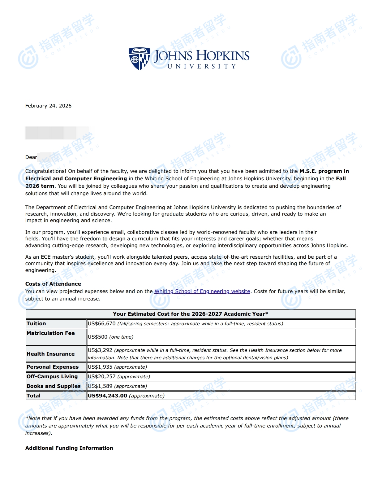 约翰霍普金斯大学电气与计算机工程工程硕士研究生offer一枚