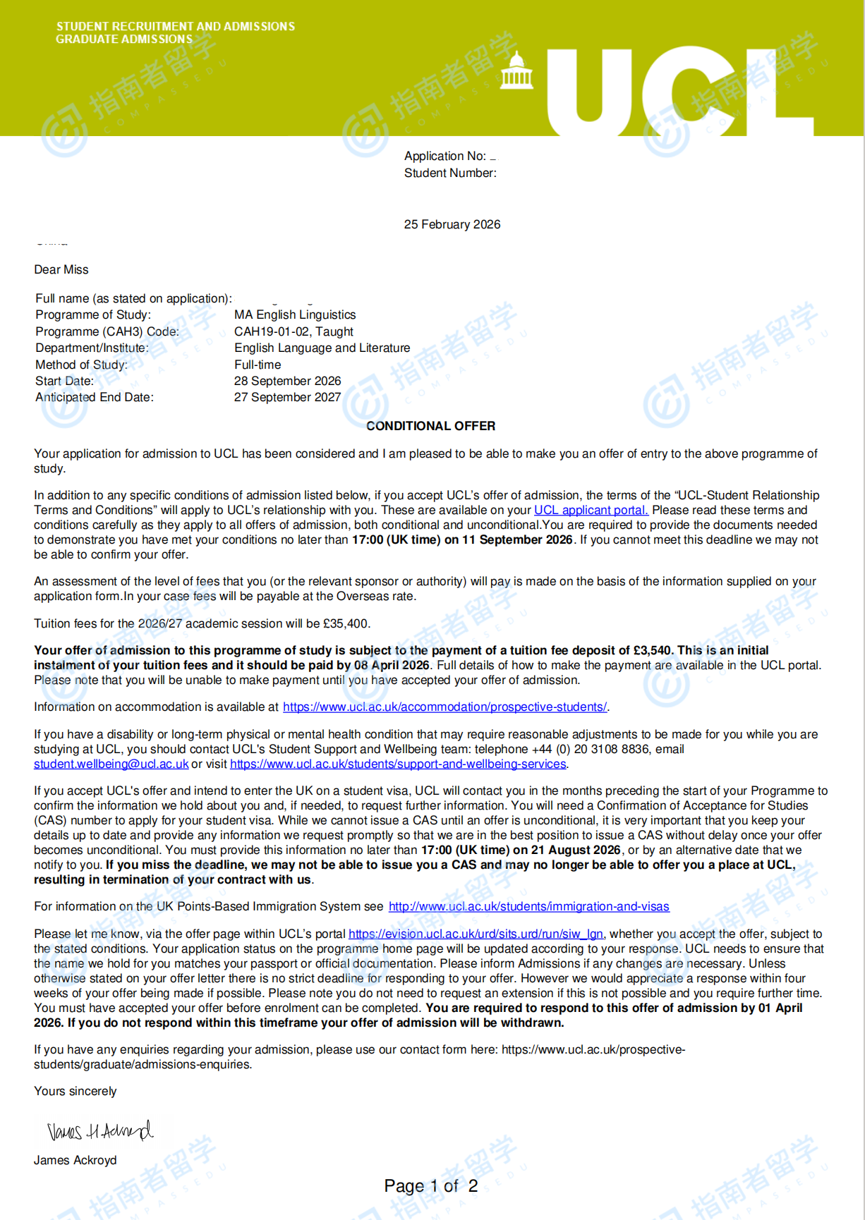 伦敦大学学院英语语言学文学硕士研究生offer一枚