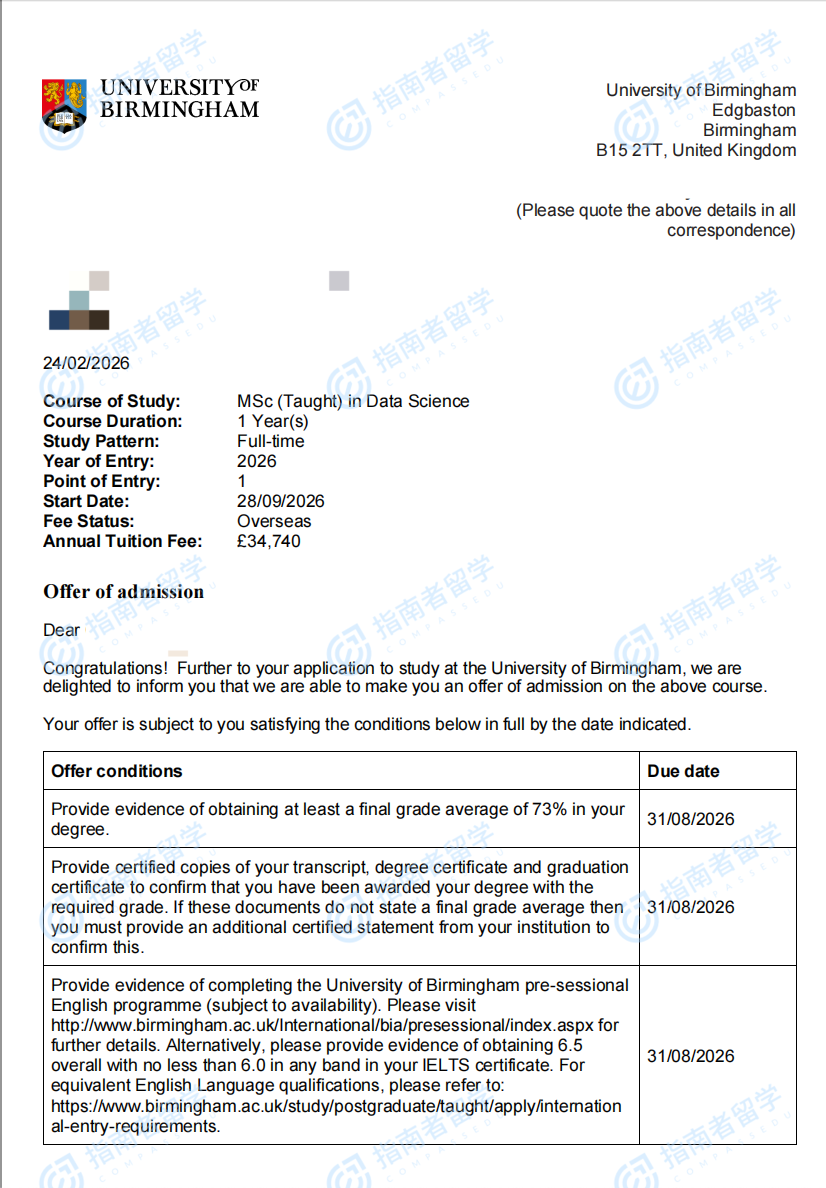 伯明翰大学数据科学理学硕士研究生offer一枚