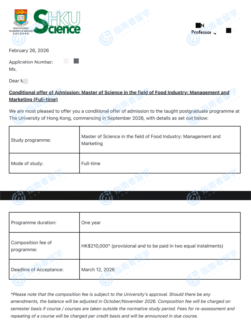 香港大学食品工业:管理与市场营销理学硕士研究生offer一枚