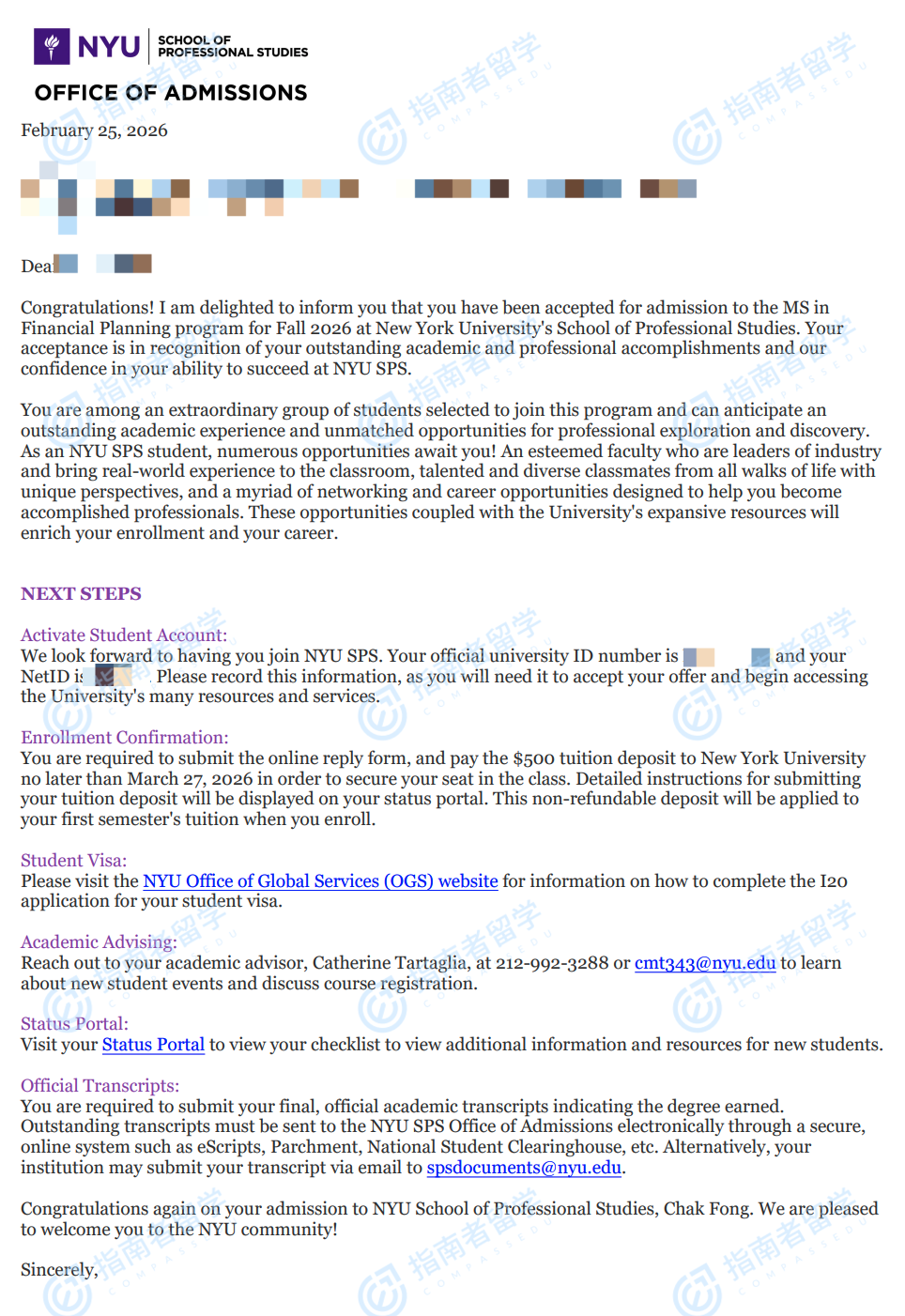 纽约大学投资规划理学硕士研究生offer一枚