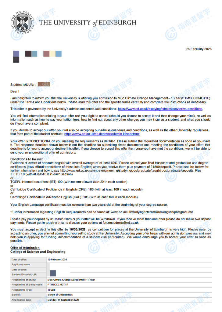 爱丁堡大学气候变化管理理学硕士研究生offer一枚