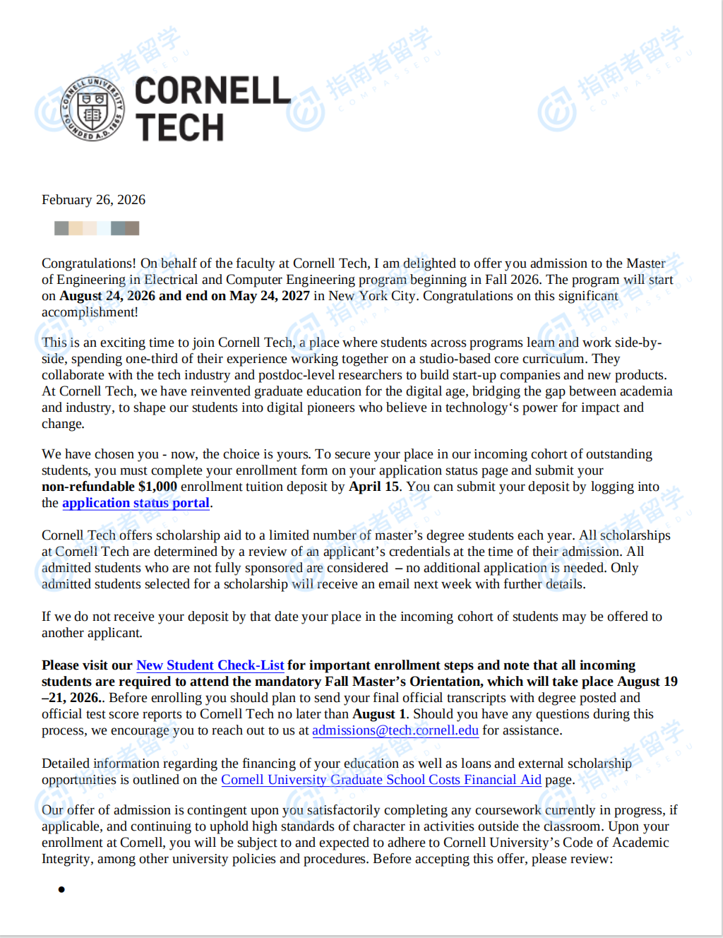 康奈尔大学电气与计算机工程硕士研究生offer一枚