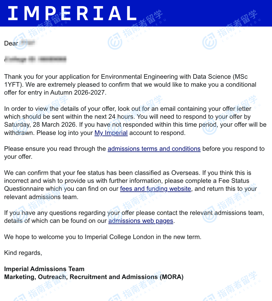 帝国理工学院环境工程与数据科学理学硕士研究生offer一枚