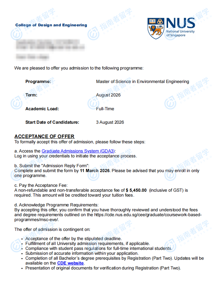 新加坡国立大学环境工程理学硕士研究生offer一枚