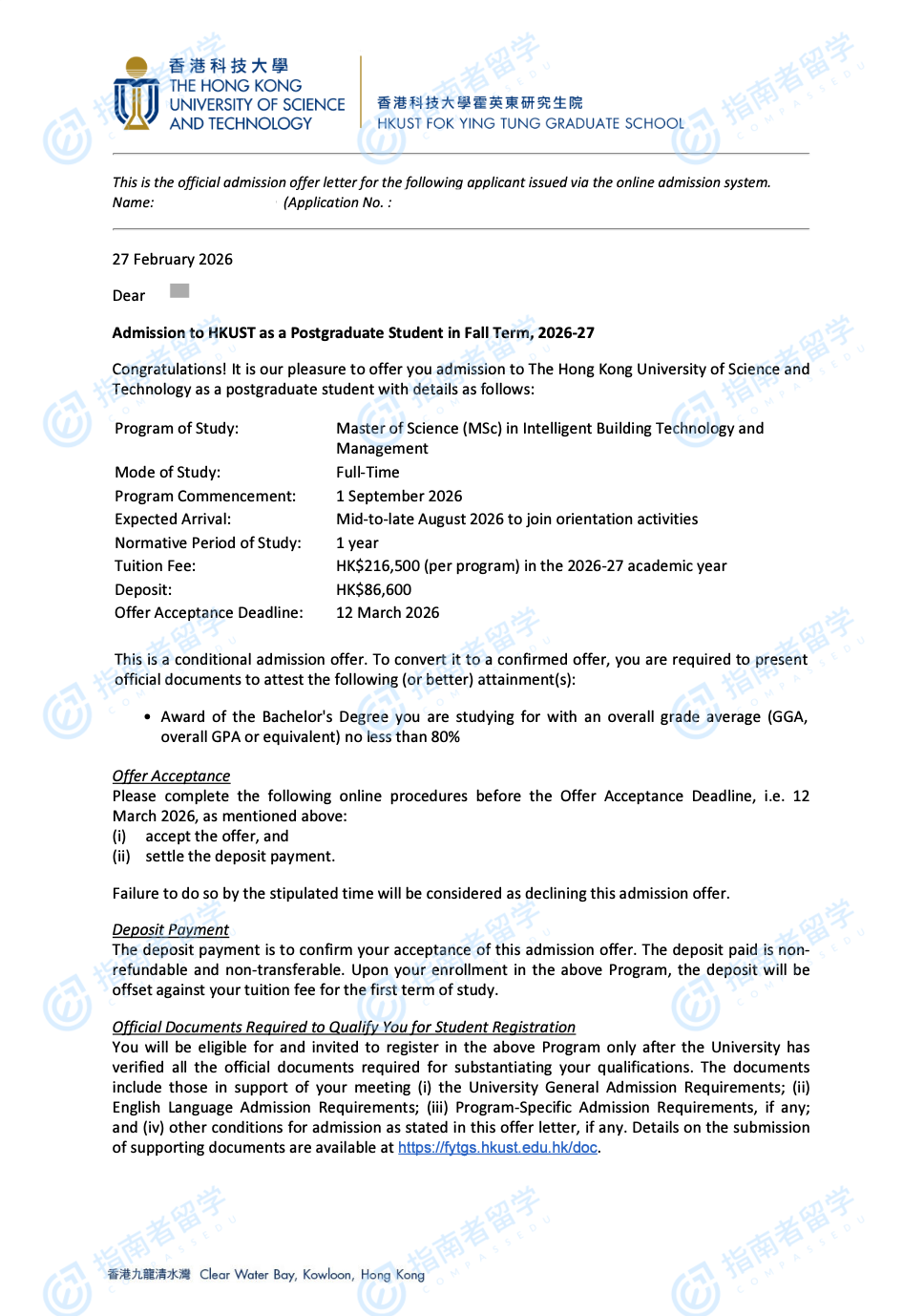 香港科技大学智能建筑物技术与管理理学硕士研究生offer一枚