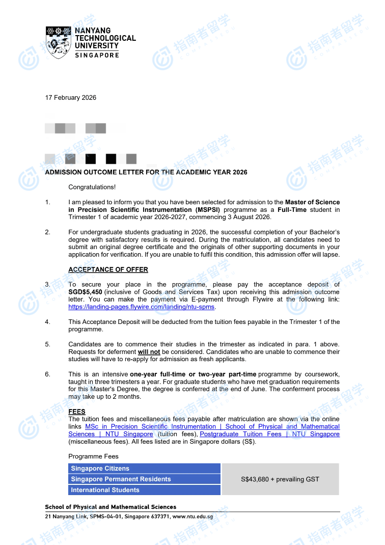南洋理工大学精密科学仪器理学硕士研究生offer一枚