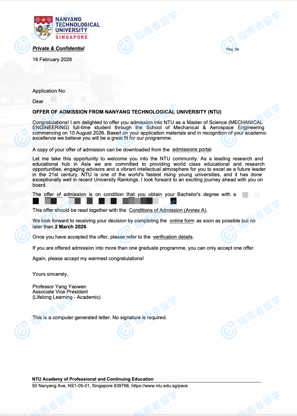 南洋理工大学机械工程理学硕士研究生offer一枚