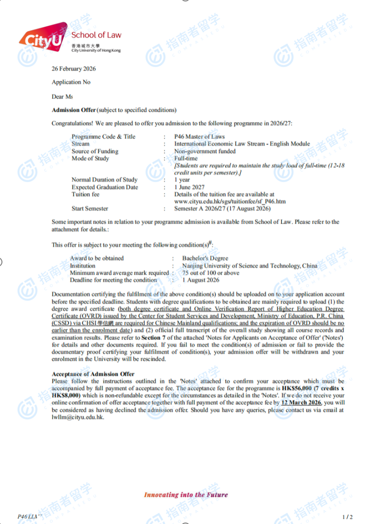 香港城市大学法学硕士研究生offer一枚