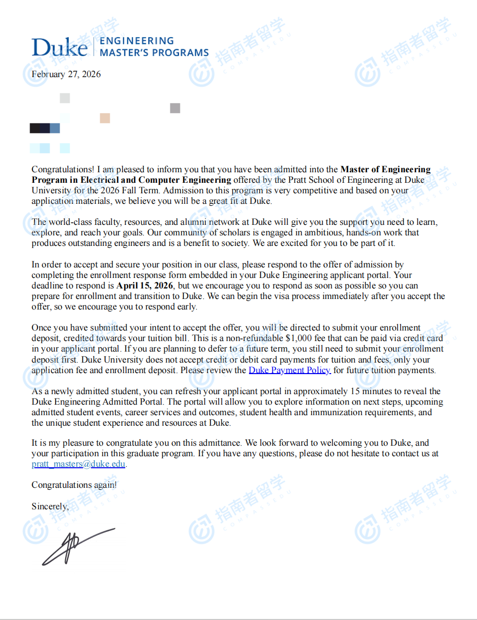 杜克大学电气与计算机工程硕士研究生offer一枚
