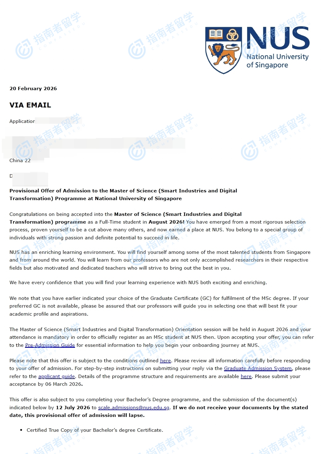 新加坡国立大学智能产业与数字化转型理学硕士研究生offer一枚