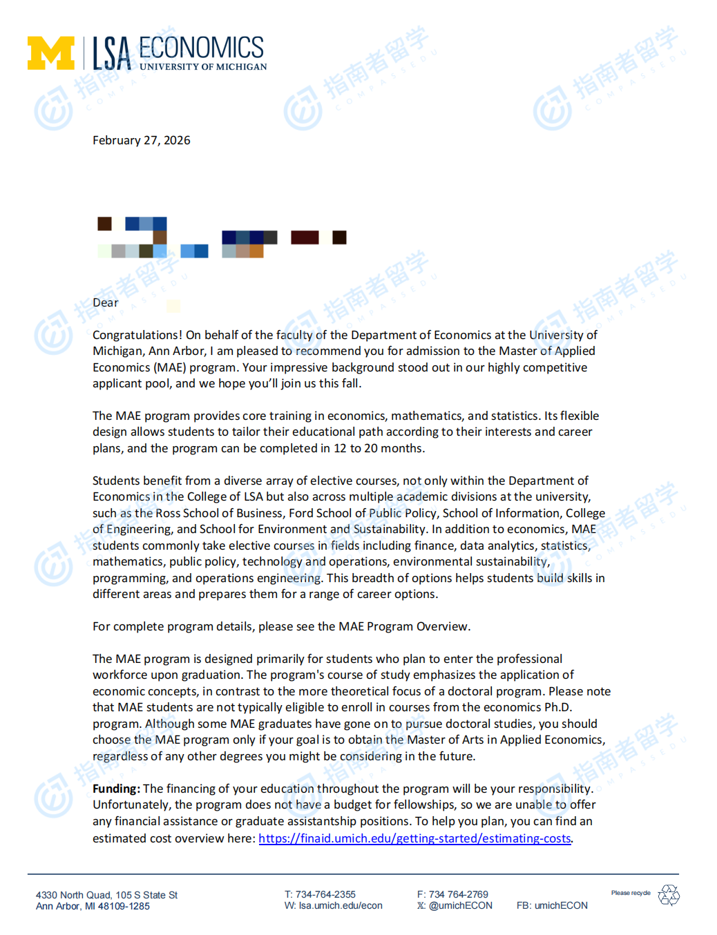 密歇根大学安娜堡分校应用经济学硕士研究生offer一枚