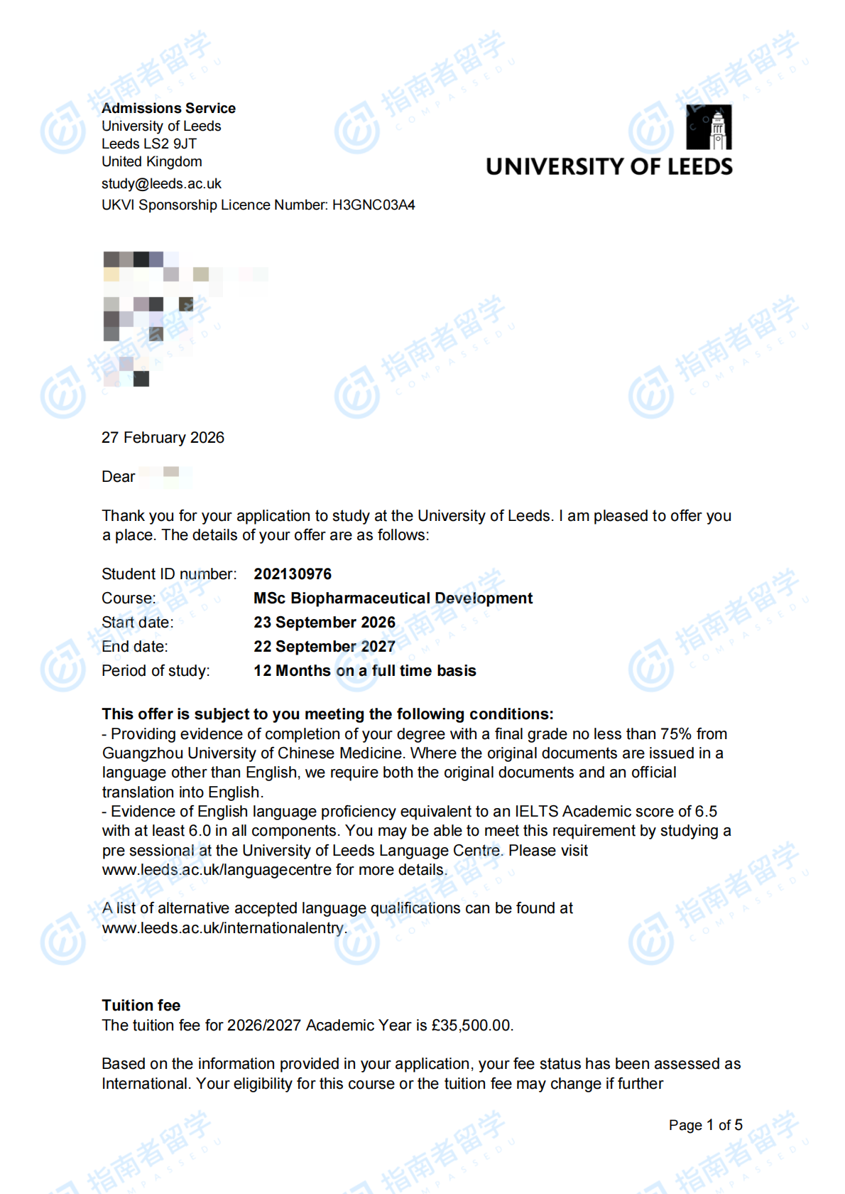 利兹大学生物医药开发理学硕士研究生offer一枚