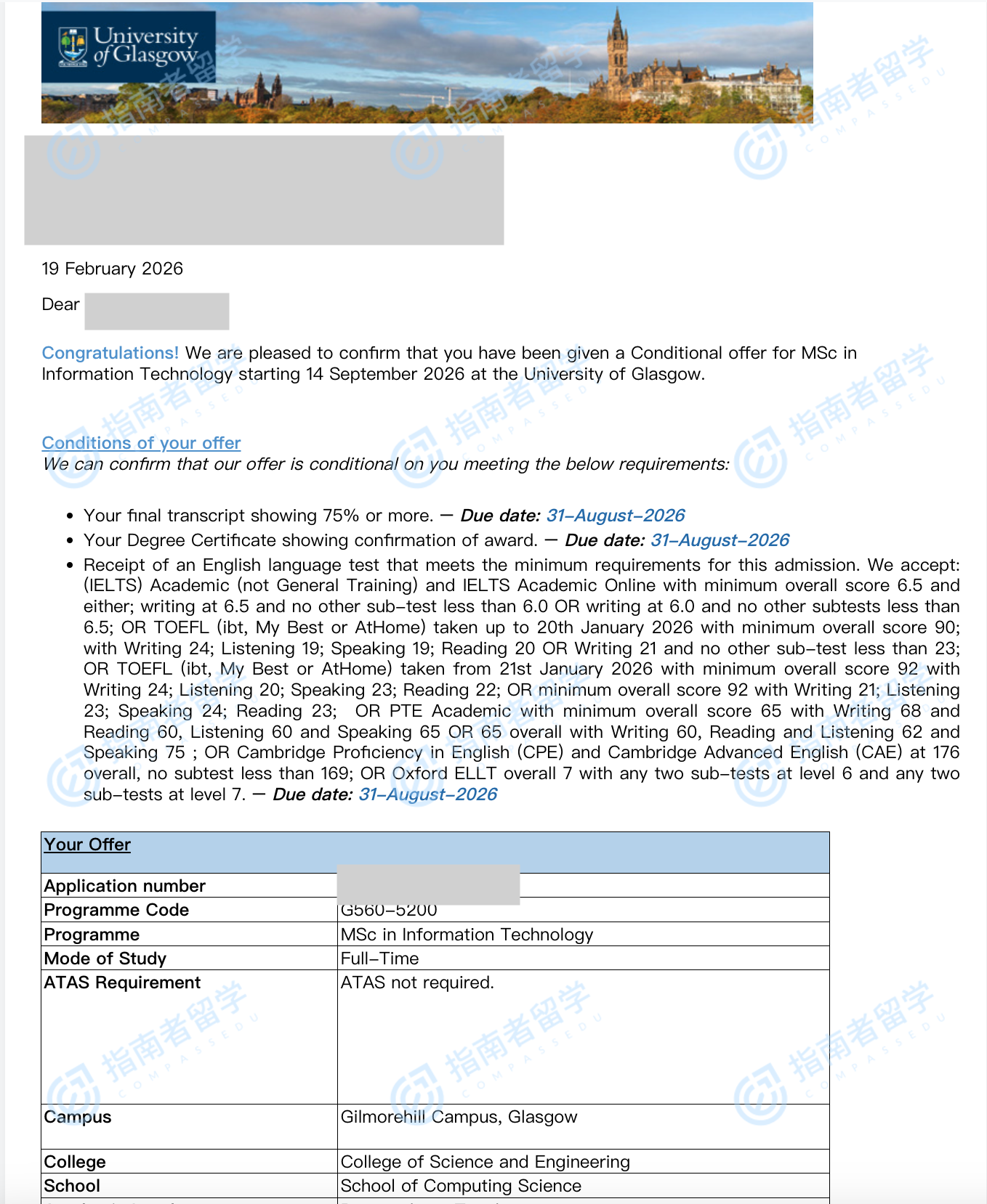 格拉斯哥大学信息技术理学硕士研究生offer一枚