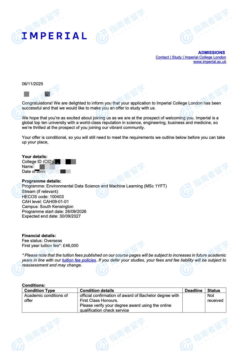 帝国理工学院环境数据科学与机器学习理学硕士研究生offer一枚