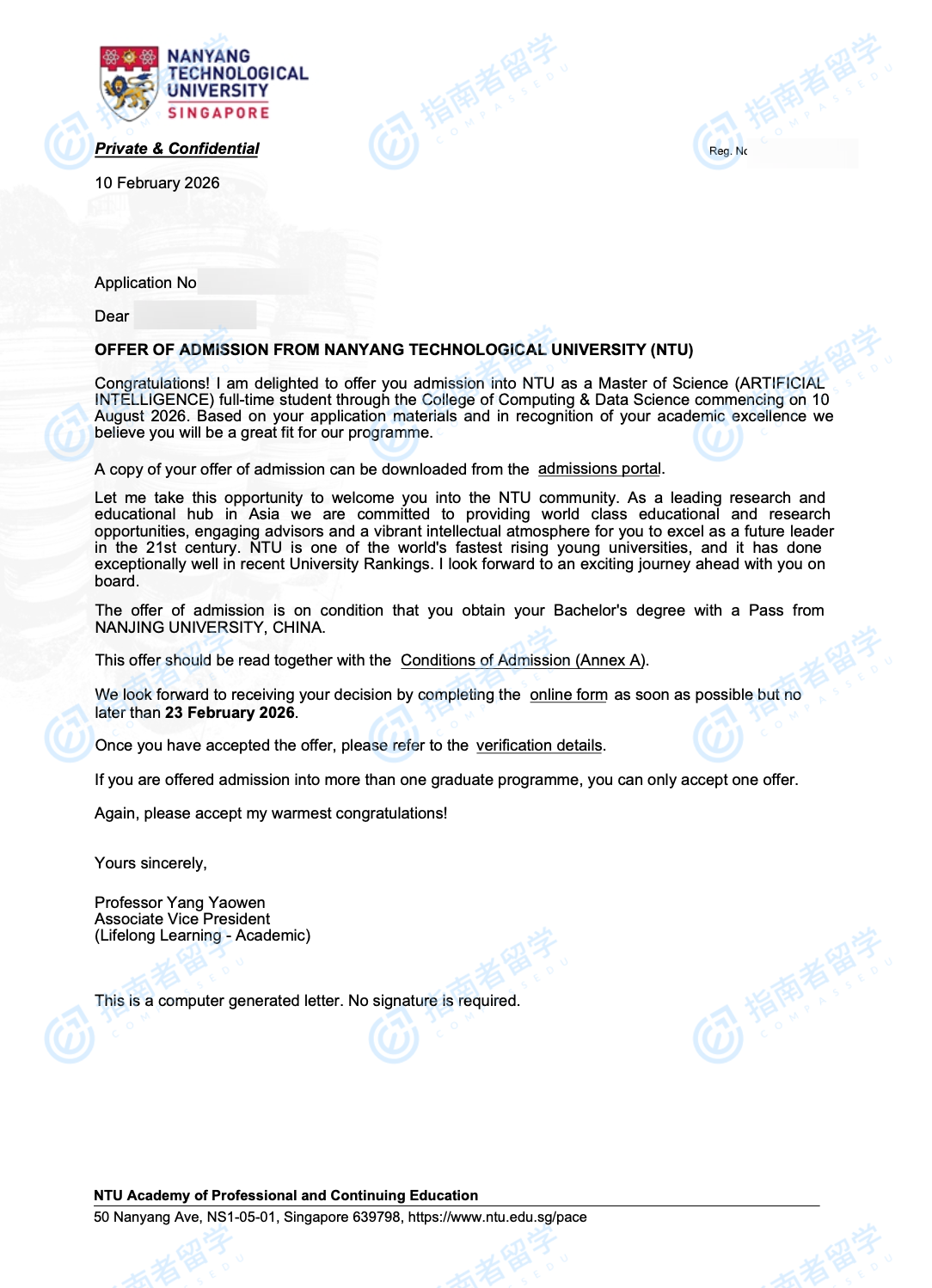 南洋理工大学人工智能理学硕士研究生offer一枚