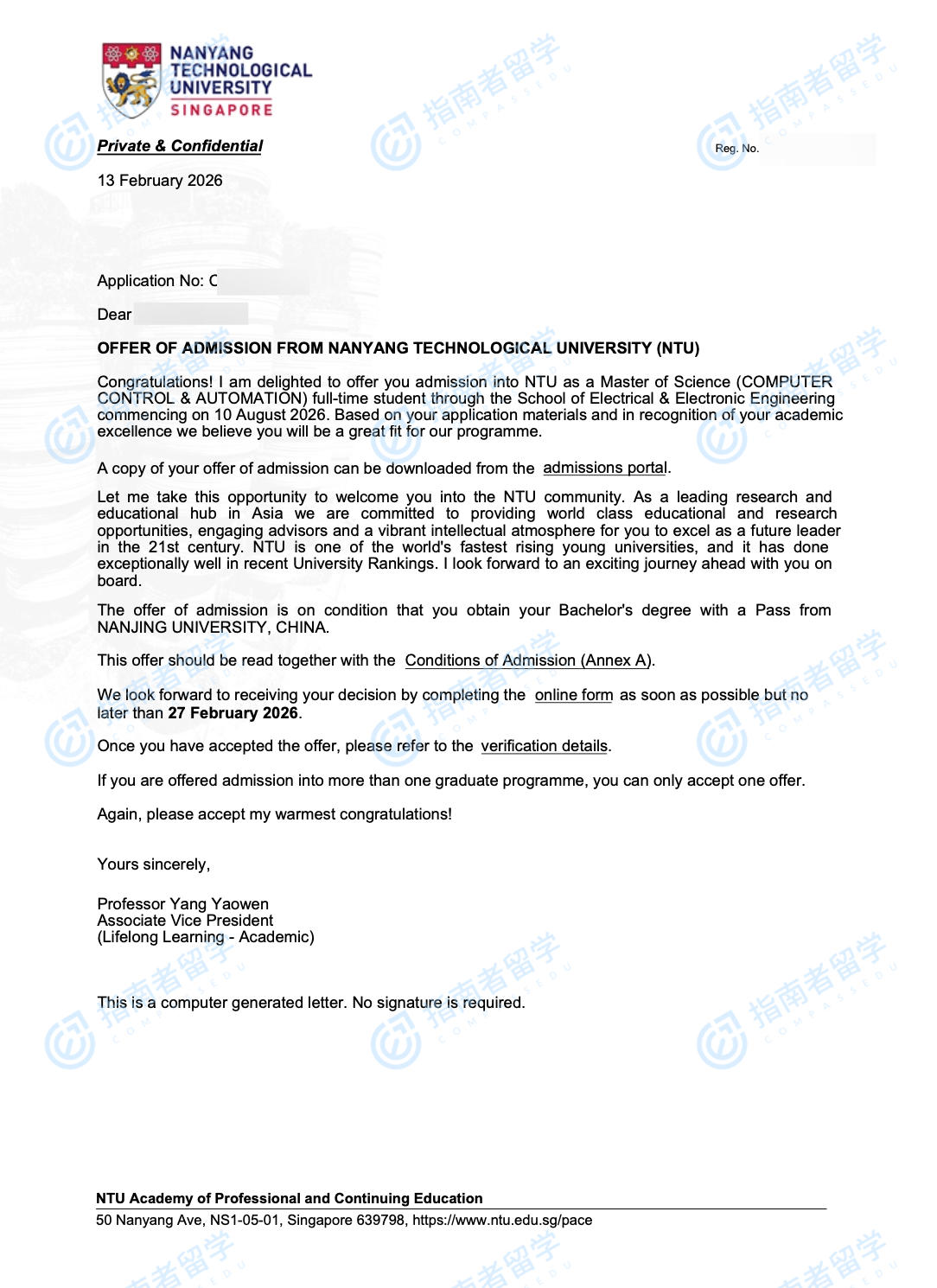 南洋理工大学计算机控制与自动化理学硕士研究生offer一枚