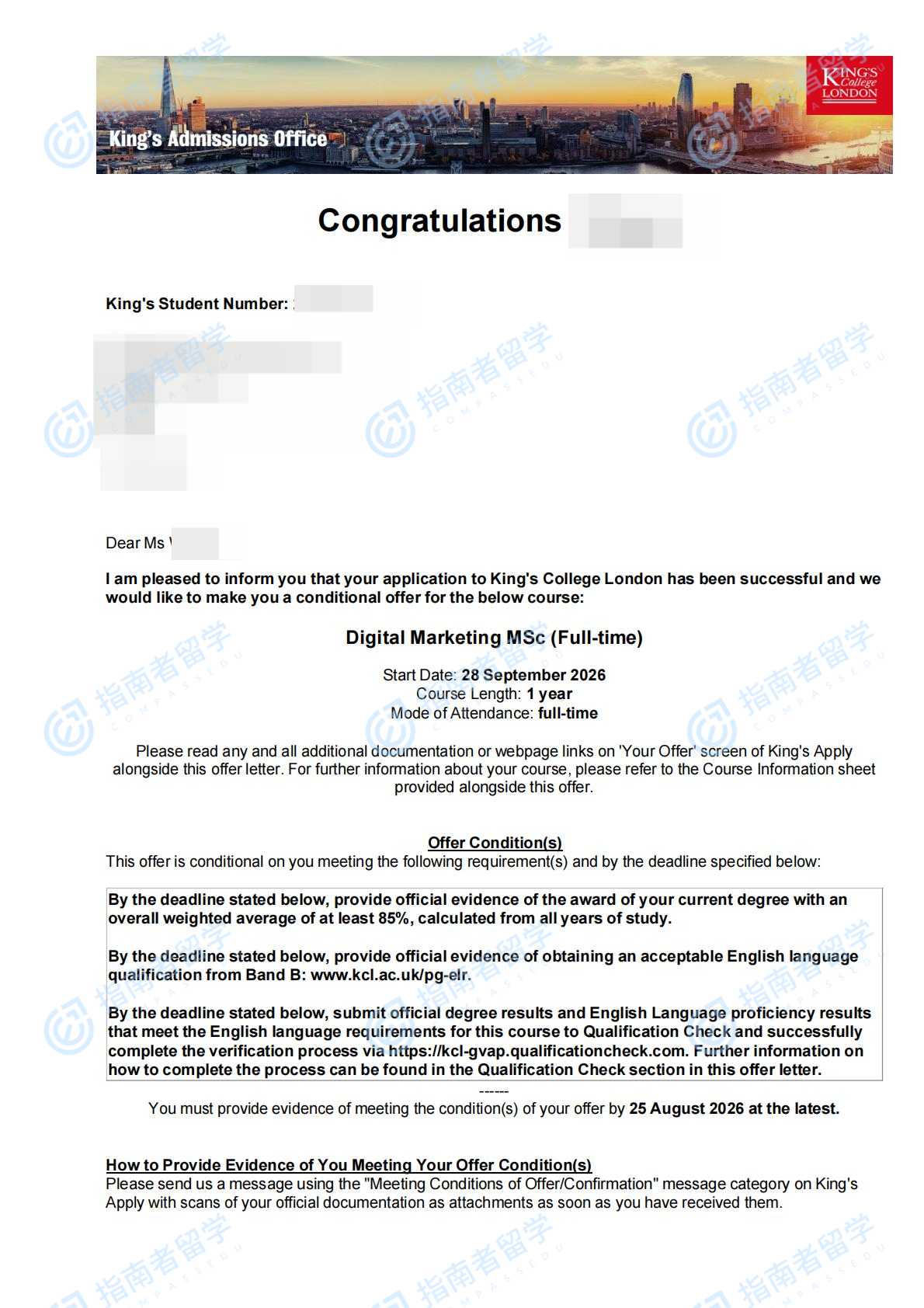 伦敦大学国王学院数字营销理学硕士研究生offer一枚
