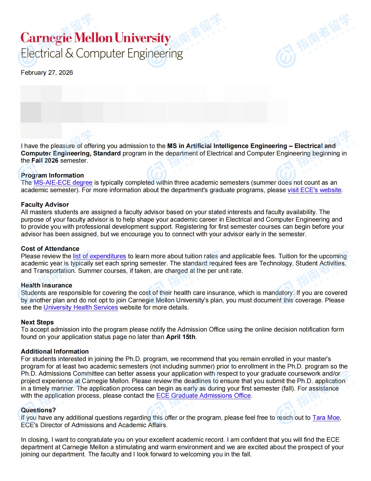 卡内基梅隆大学人工智能工程硕士项目(标准方向)研究生offer一枚