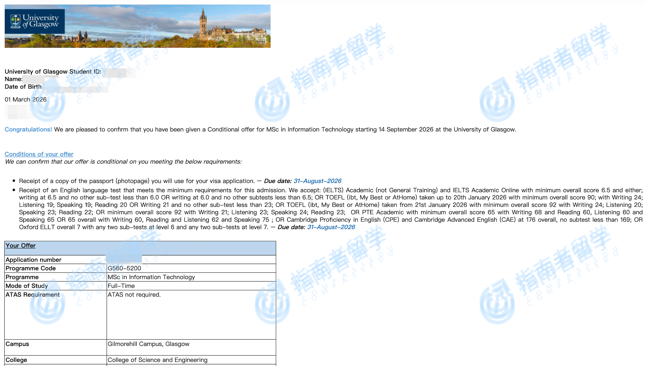 格拉斯哥大学信息技术理学硕士研究生offer一枚