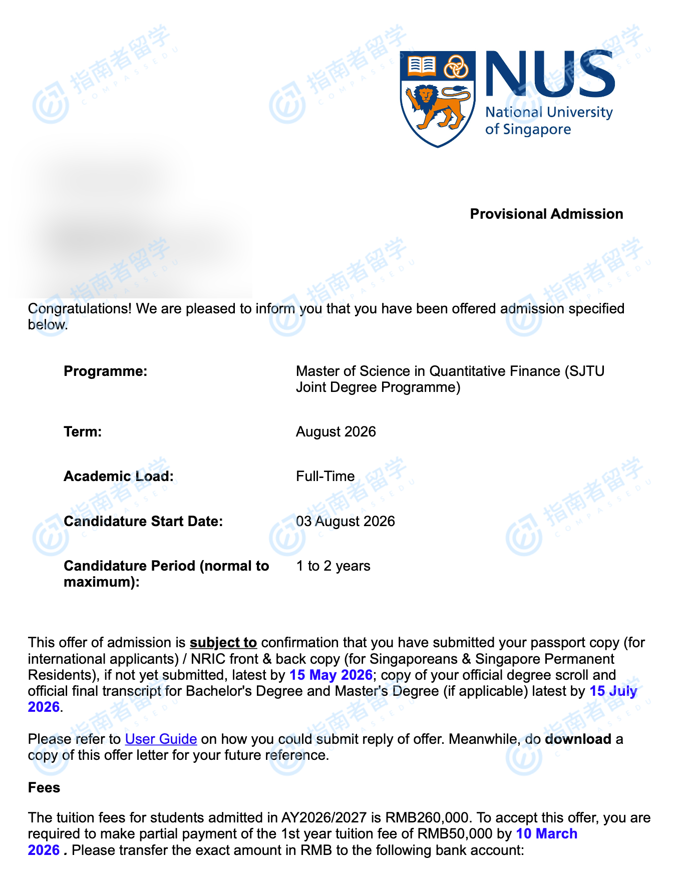 新加坡国立大学定量金融理学硕士(新加坡国立大学-上海交通大学联合开设)研究生offer一枚