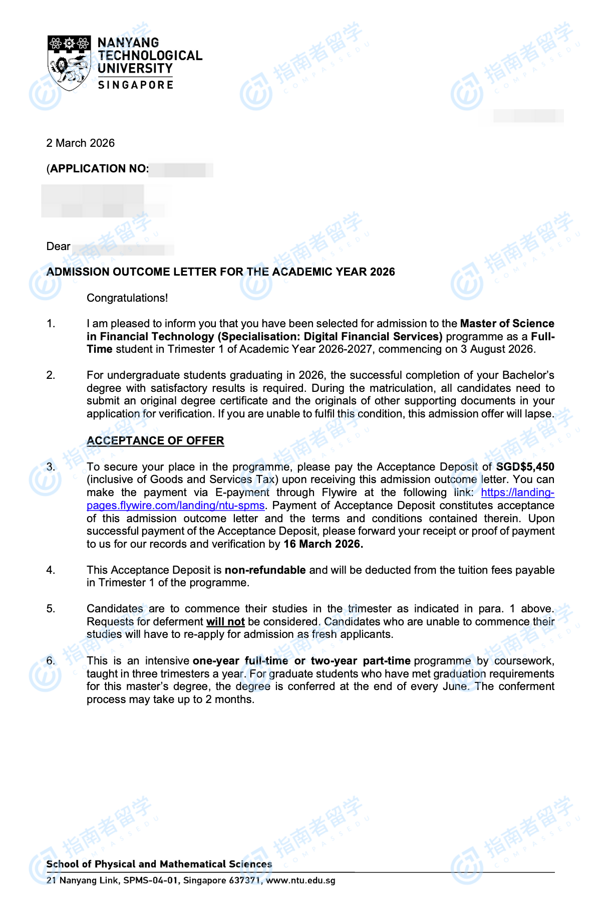 南洋理工大学金融科技理学硕士(数字金融服务)研究生offer一枚