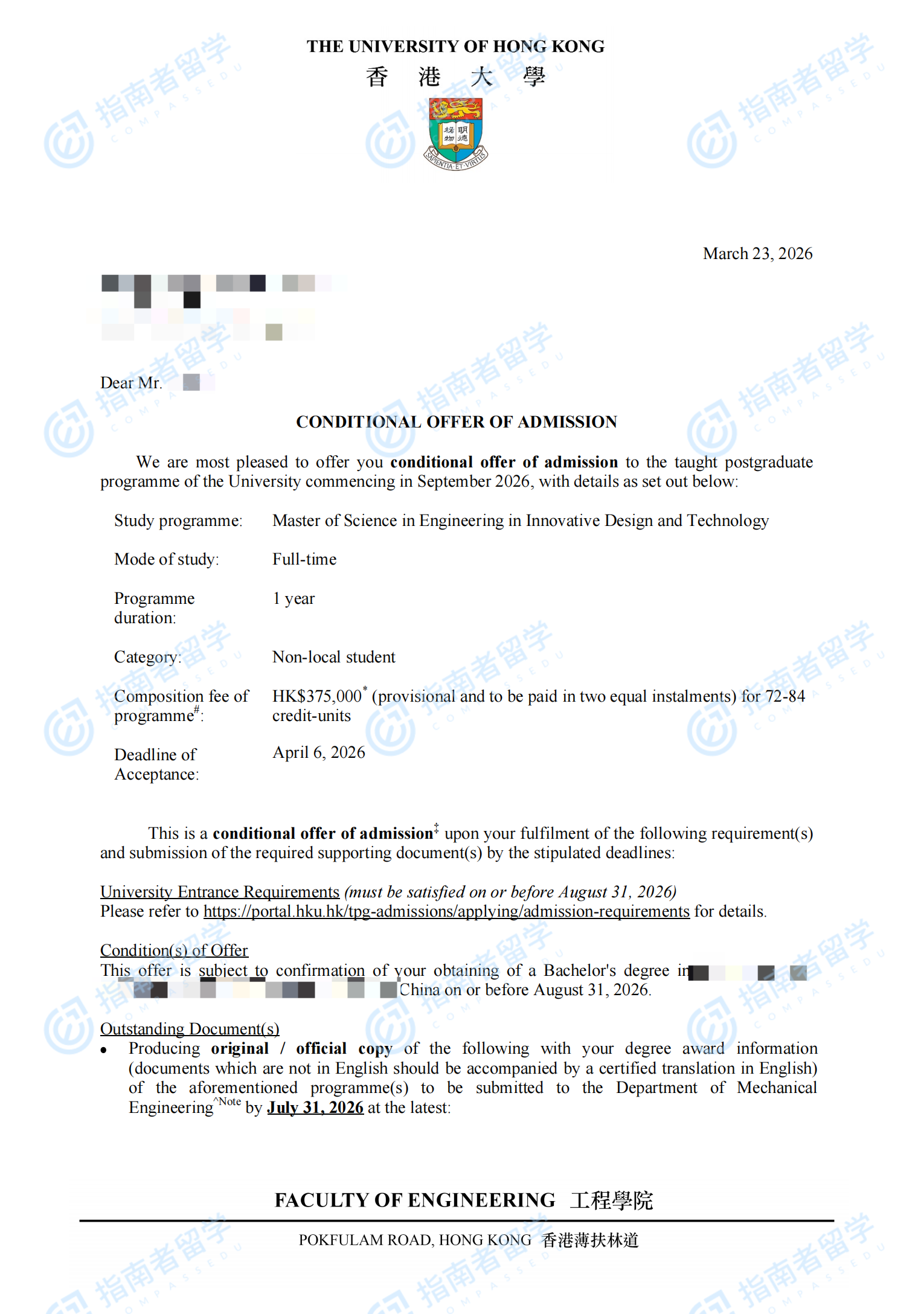 香港大学创新设计与科技(工程)理学硕士研究生offer一枚