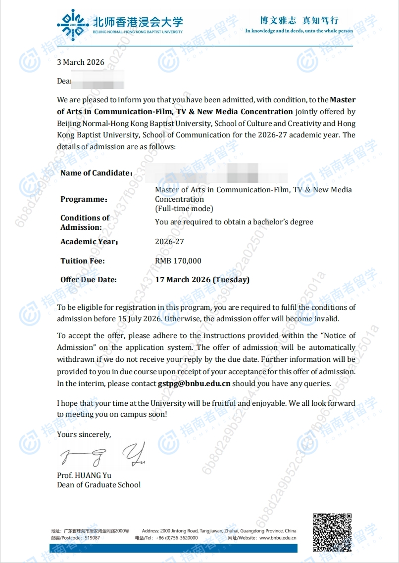 香港浸会大学传播学文学硕士 影视与新媒体制片管理专修(北师港浸大)研究生offer一枚