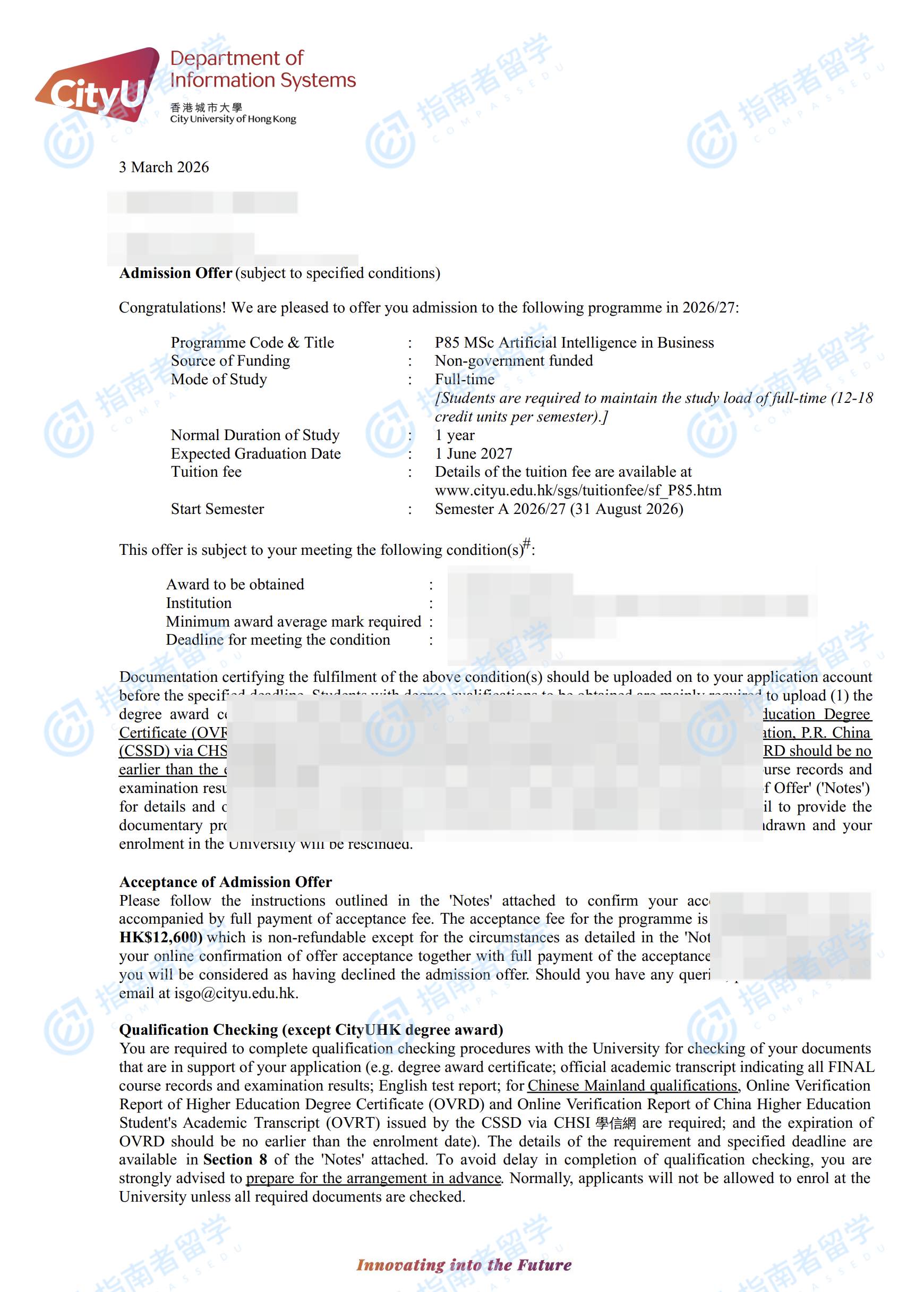香港城市大学商业人工智能理学硕士研究生offer一枚
