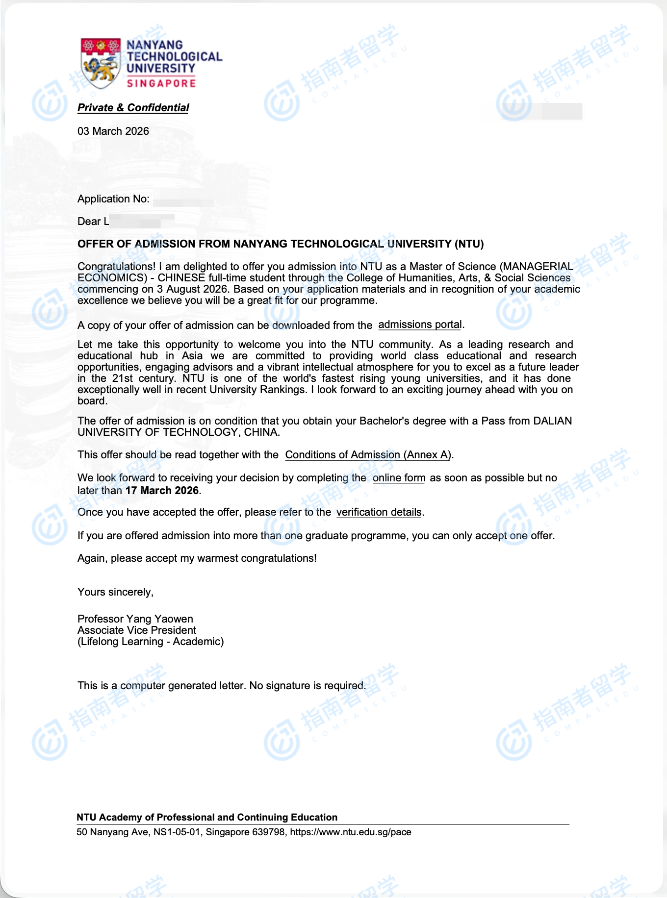 南洋理工大学管理经济学理学硕士(中文授课)研究生offer一枚