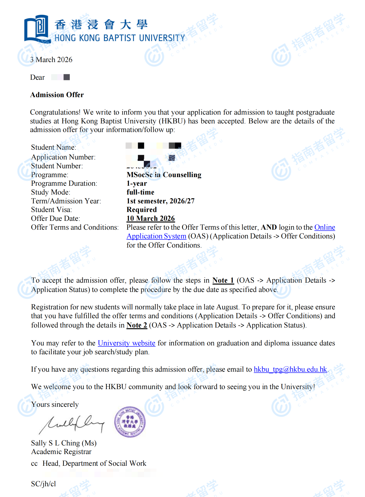 香港浸会大学辅导学社会科学硕士研究生offer一枚