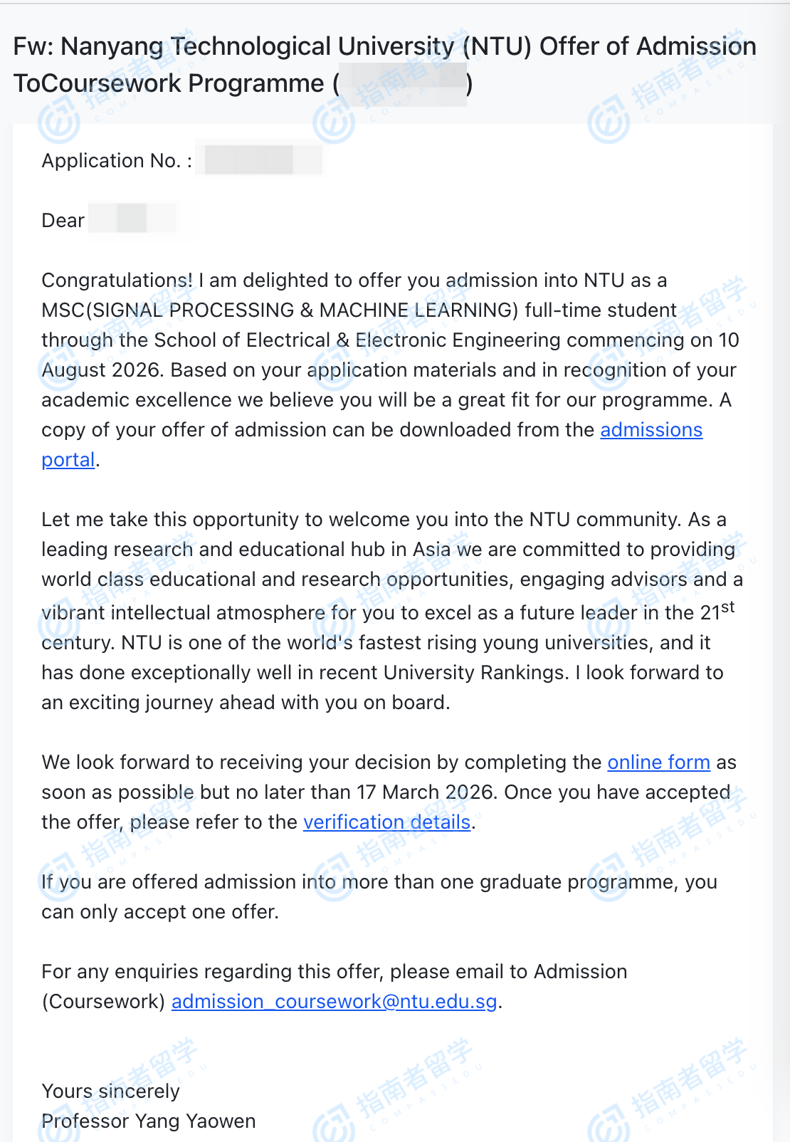 南洋理工大学信号处理和机器学习理学硕士研究生offer一枚
