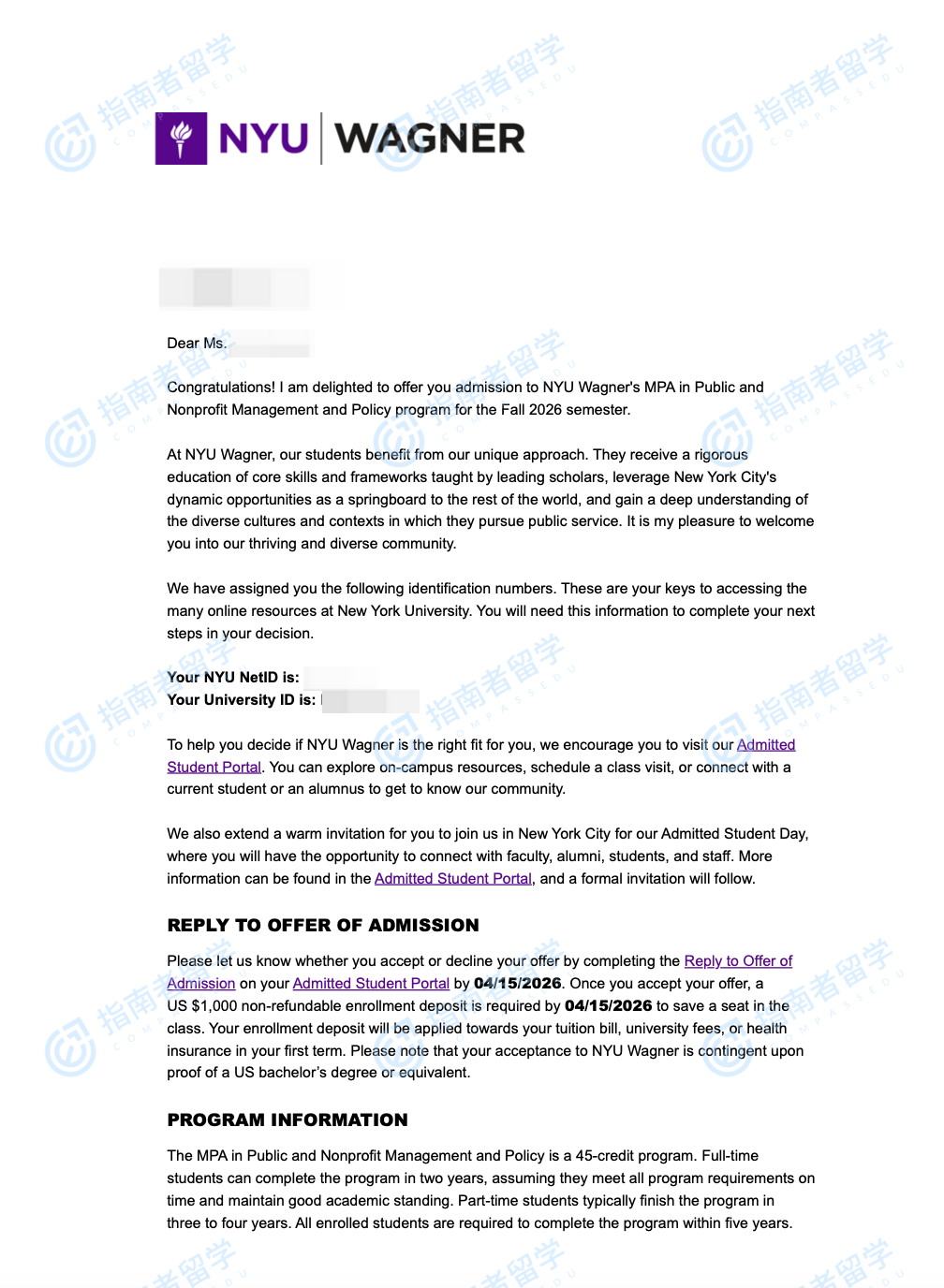 纽约大学公共、非盈利管理与政策公共事务硕士研究生offer一枚