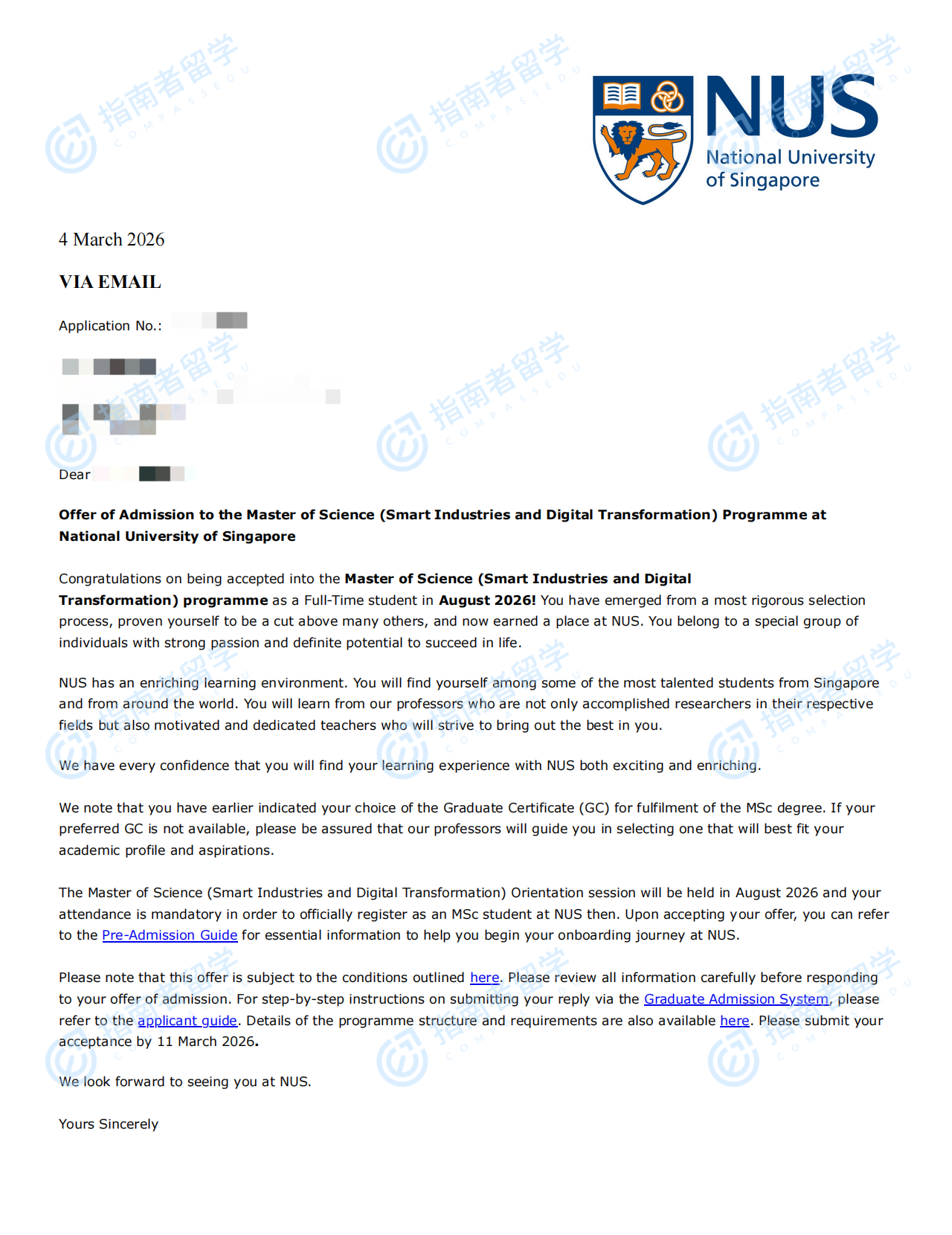 新加坡国立大学智能产业与数字化转型理学硕士研究生offer一枚