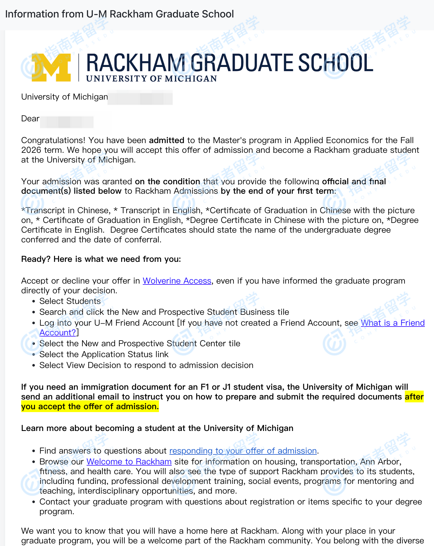 密歇根大学安娜堡分校应用经济学硕士研究生offer一枚