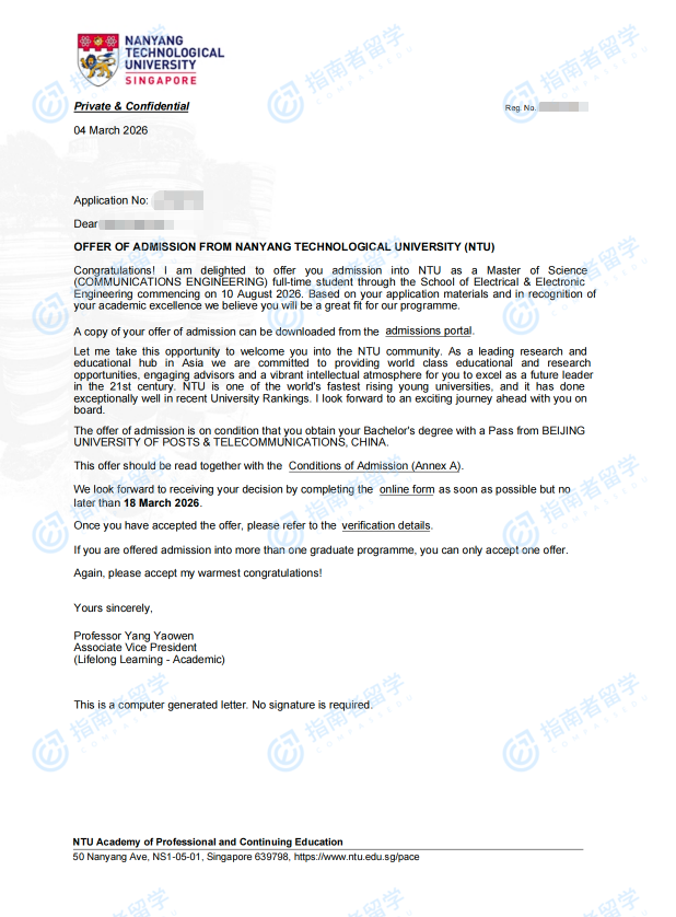 南洋理工大学通信工程理学硕士研究生offer一枚