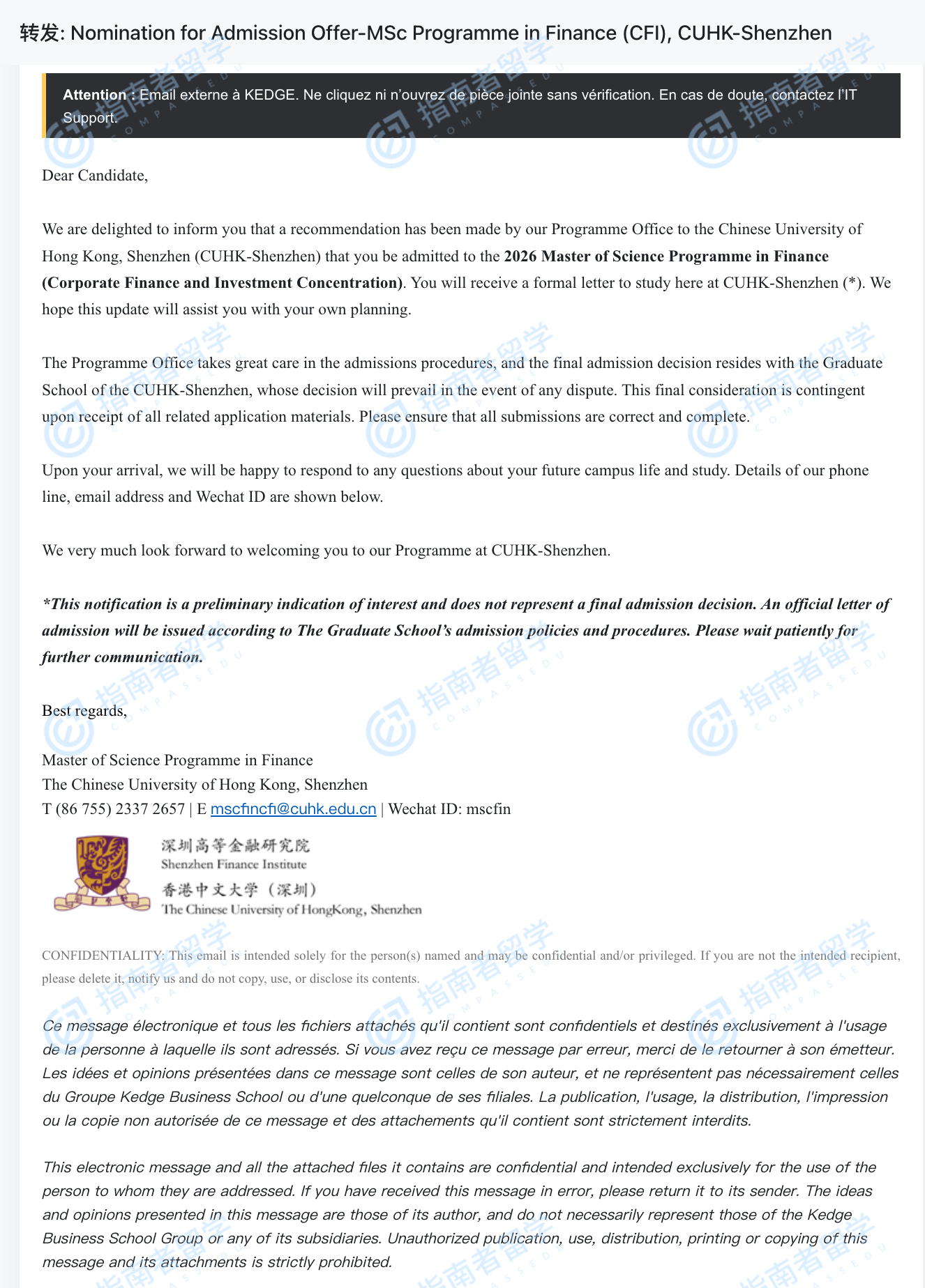 香港中文大学金融学理学硕士(CUHK-Shenzhen)研究生offer一枚
