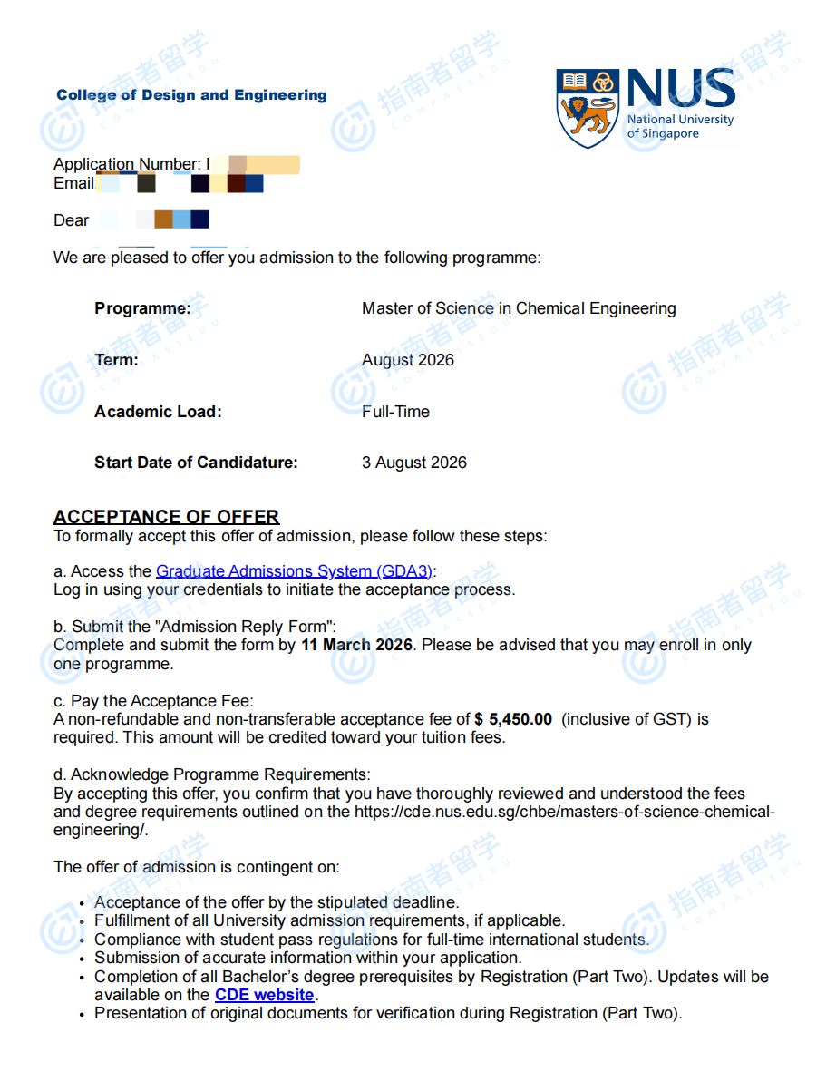 新加坡国立大学化学工程理学硕士研究生offer一枚