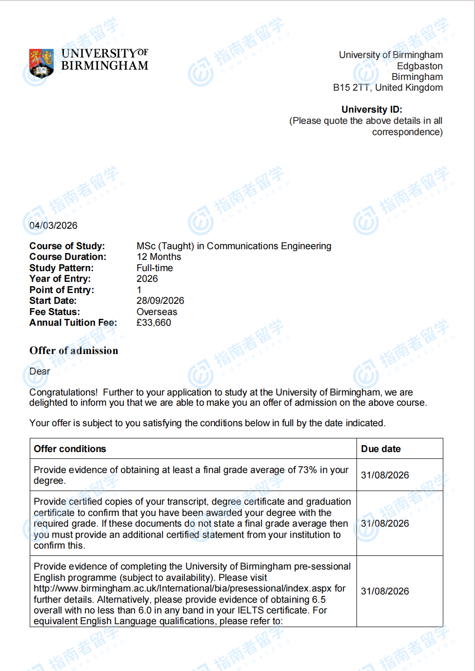 伯明翰大学通信工程理学硕士研究生offer一枚