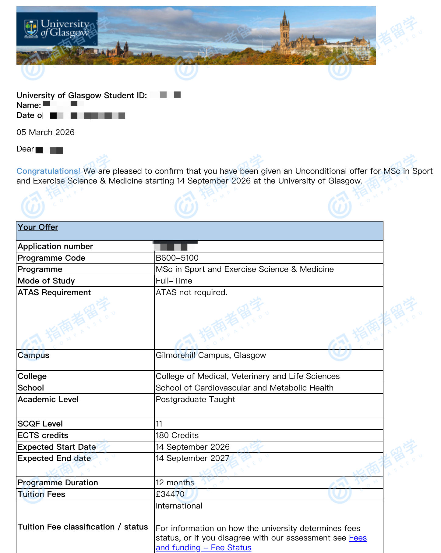 格拉斯哥大学体育与运动科学和医学理学硕士研究生offer一枚