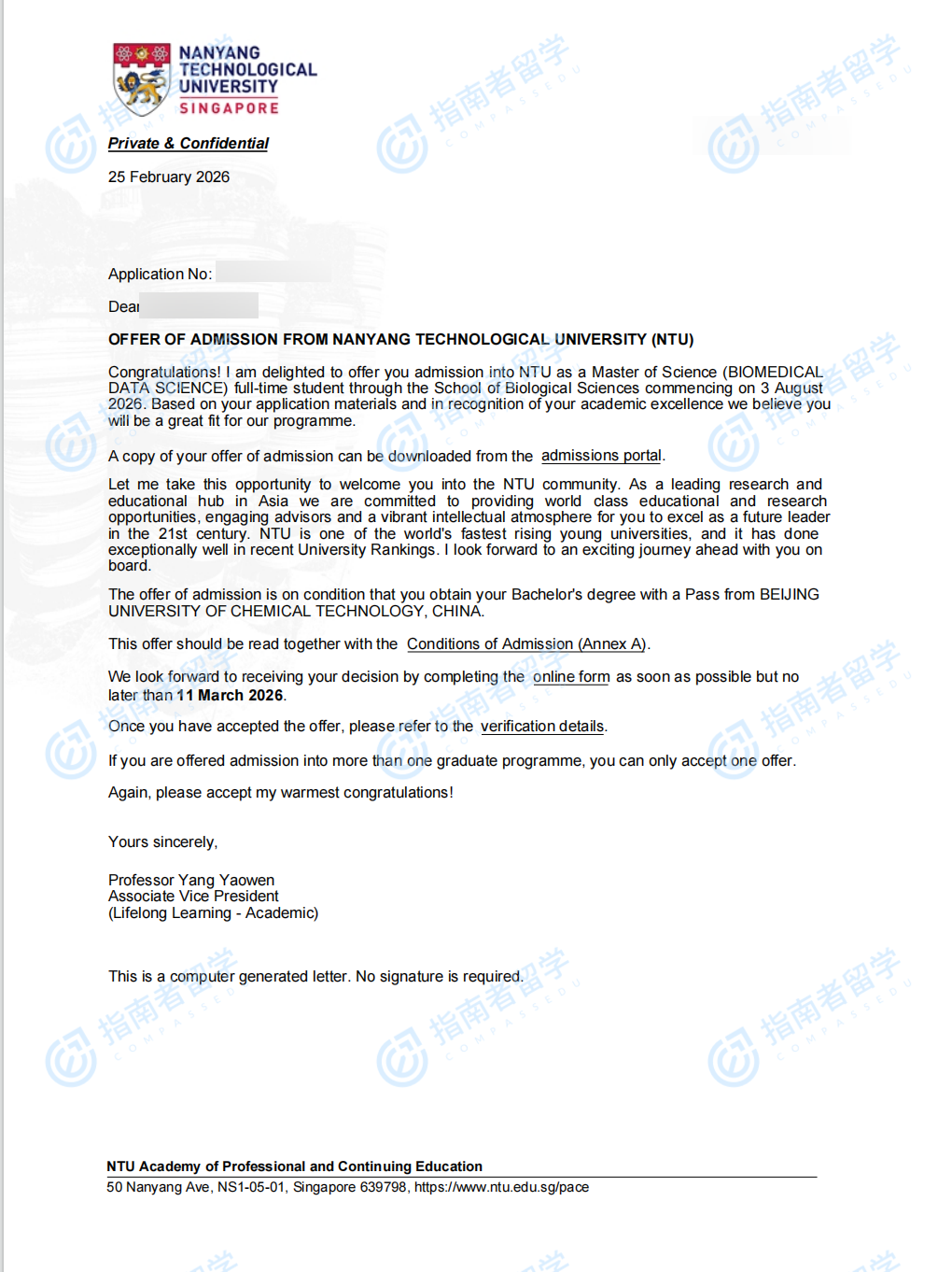 南洋理工大学生物医学数据科学理学硕士研究生offer一枚