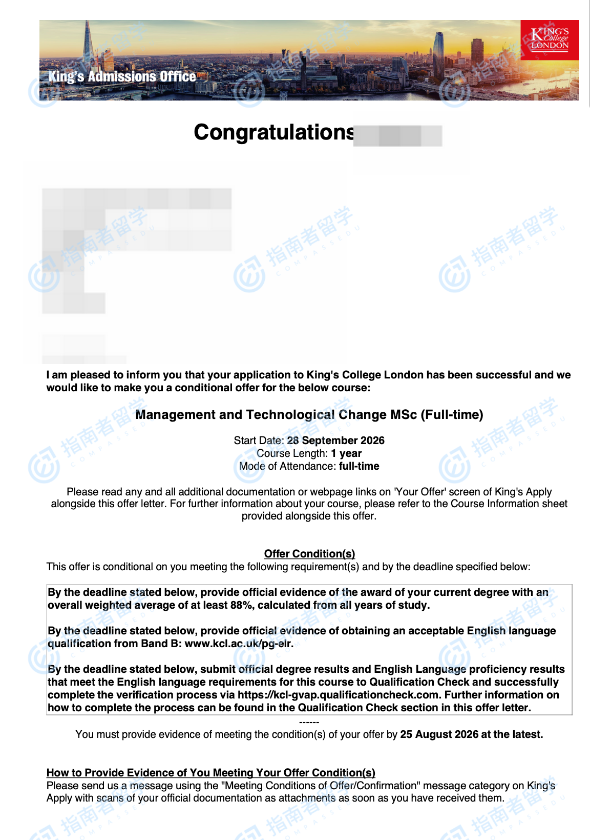 伦敦大学国王学院管理与技术变革理学硕士研究生offer一枚