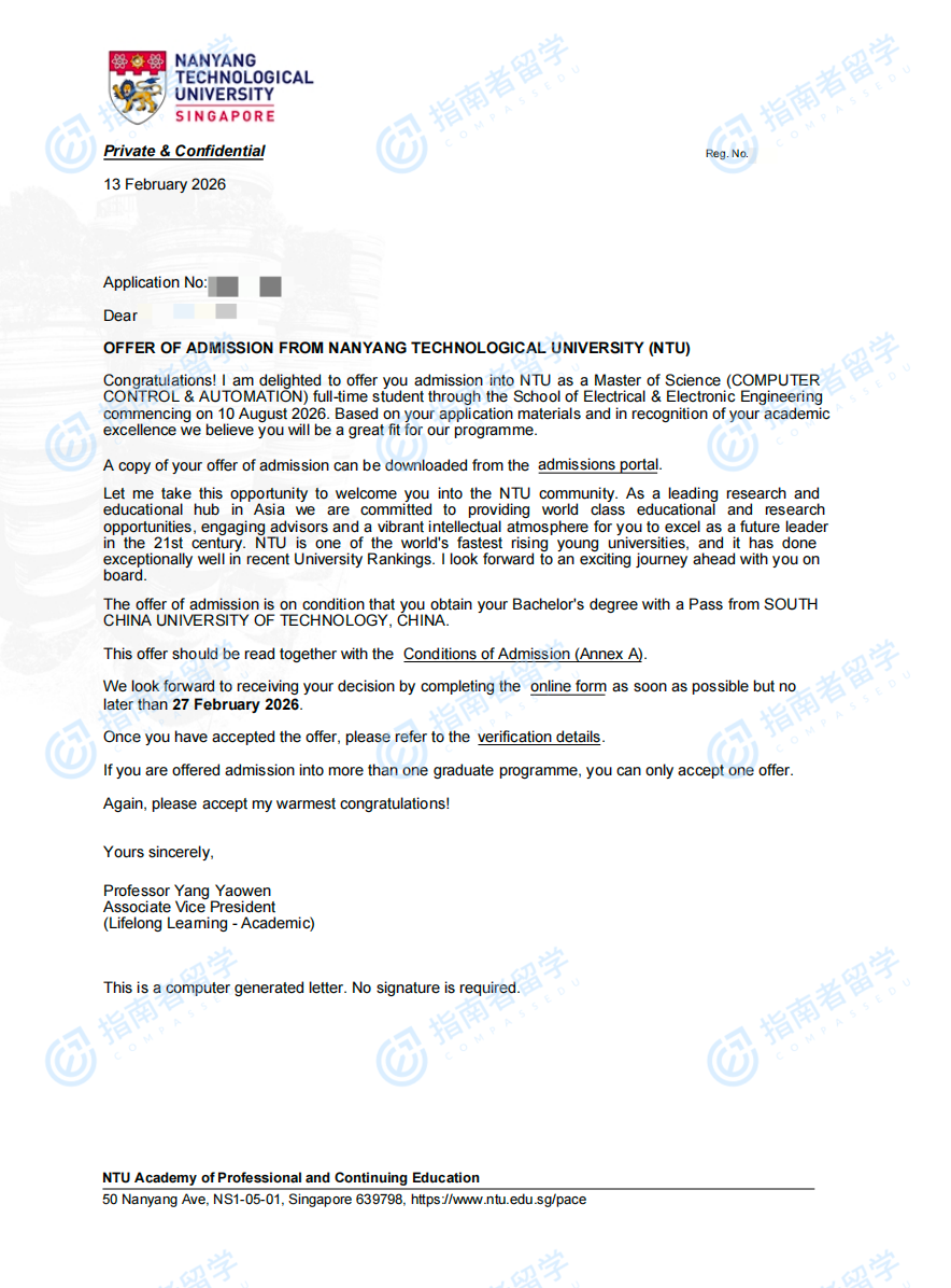 南洋理工大学计算机控制与自动化理学硕士研究生offer一枚
