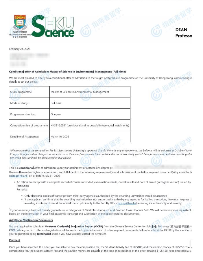 香港大学环境管理学理学硕士研究生offer一枚