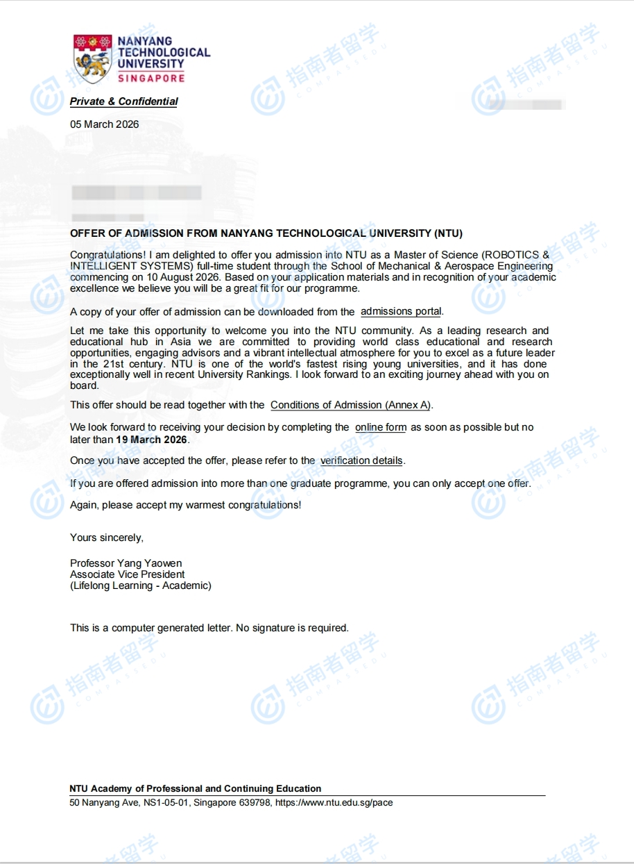 南洋理工大学机器人与智能系统理学硕士研究生offer一枚
