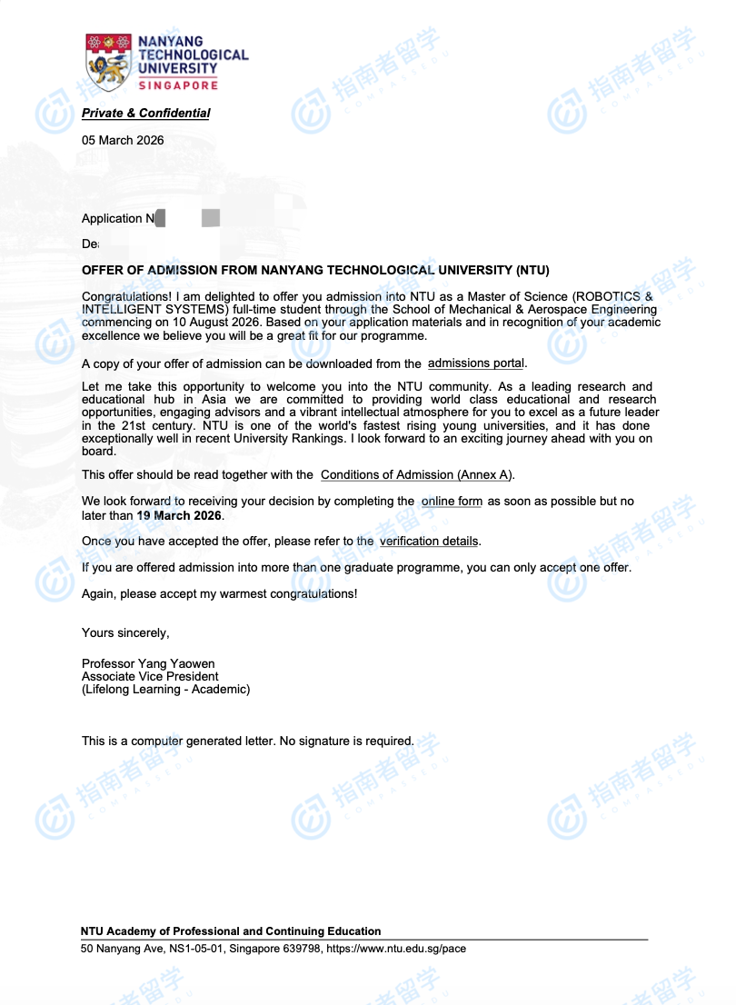南洋理工大学机器人与智能系统理学硕士研究生offer一枚