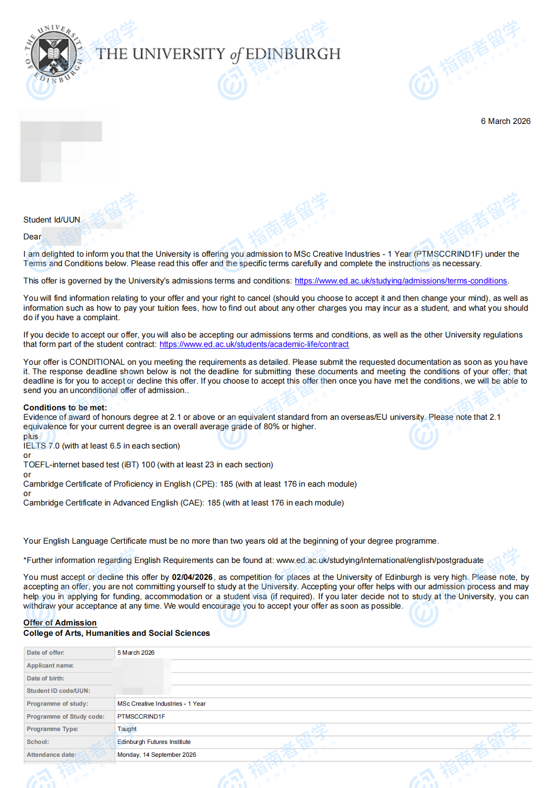 爱丁堡大学创意产业理学硕士研究生offer一枚