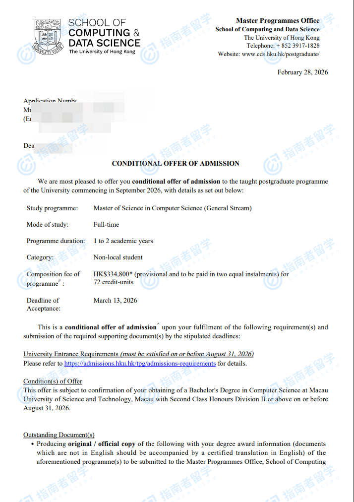 香港大学计算机科学理学硕士(常规方向)研究生offer一枚