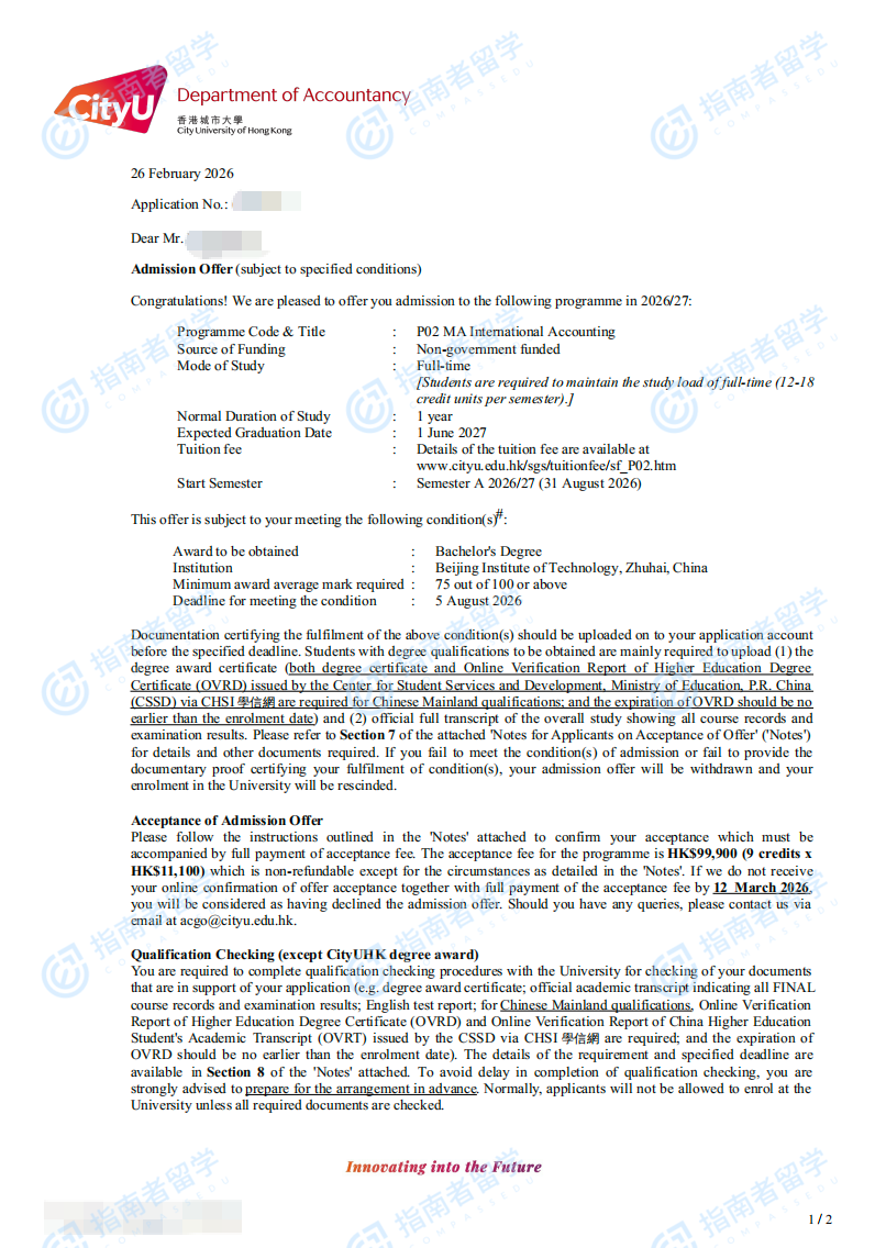 香港城市大学国际会计学文学硕士研究生offer一枚